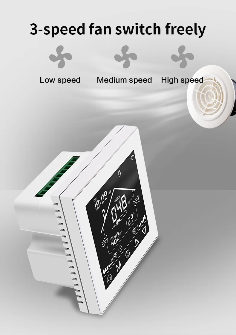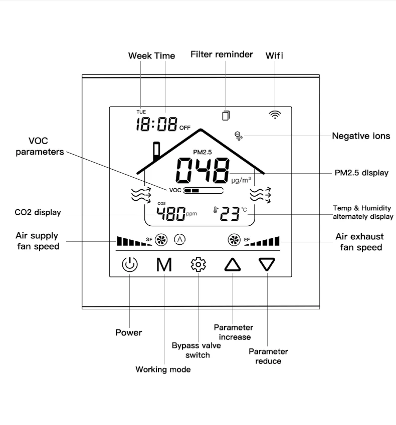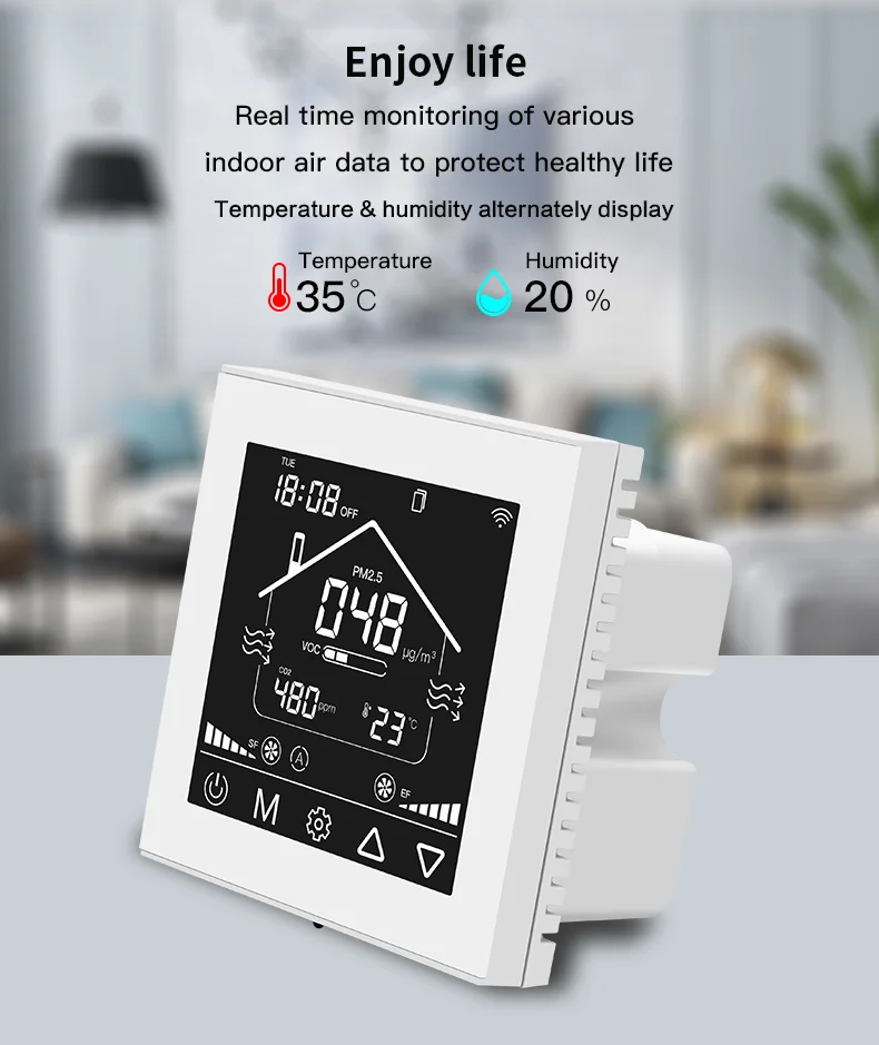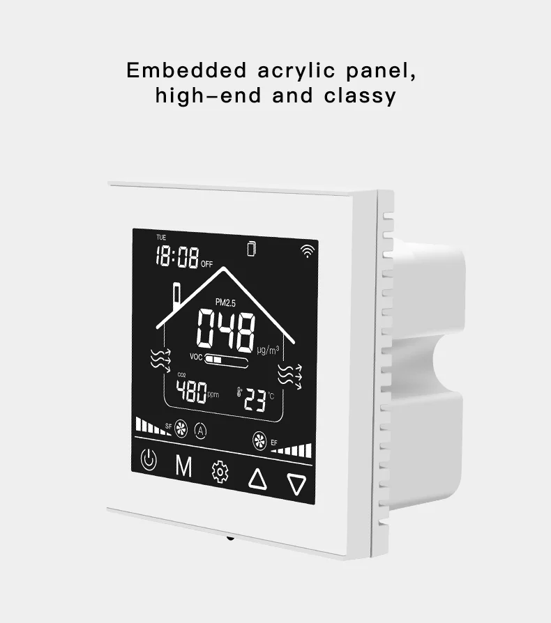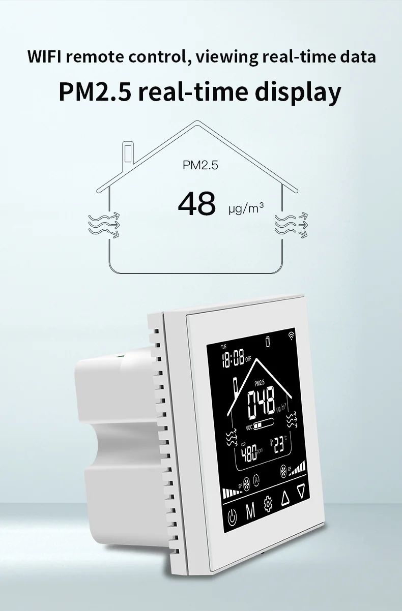 2024 New Arrival VOC PM2.5 CO2 Ventilation ControllerModel Number: GM900 Power Supply: AC110-240V, 50/60Hz Product name:Fresh air ventilation system controller Built in sensors:CO2+VOC+PM2.5+Temperature+Humidity WIFI function:Tuya Mounting method:Wall mounting Customized functions design:Support Suitable for fans:AC/EC/DC