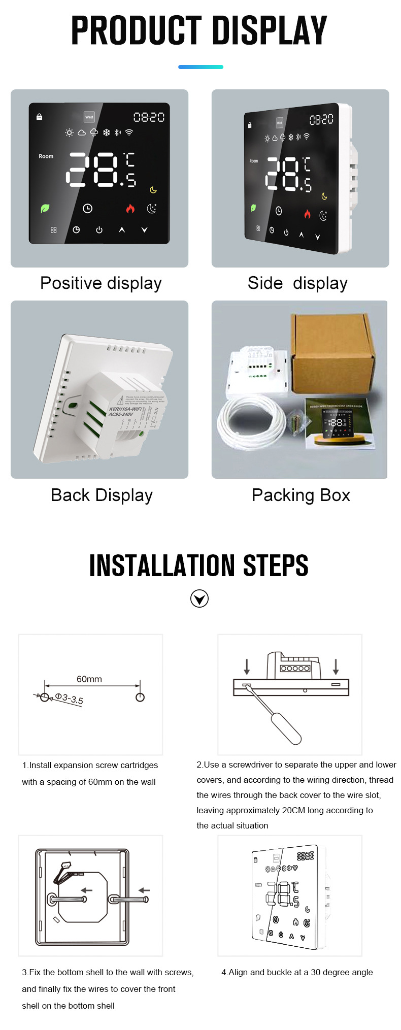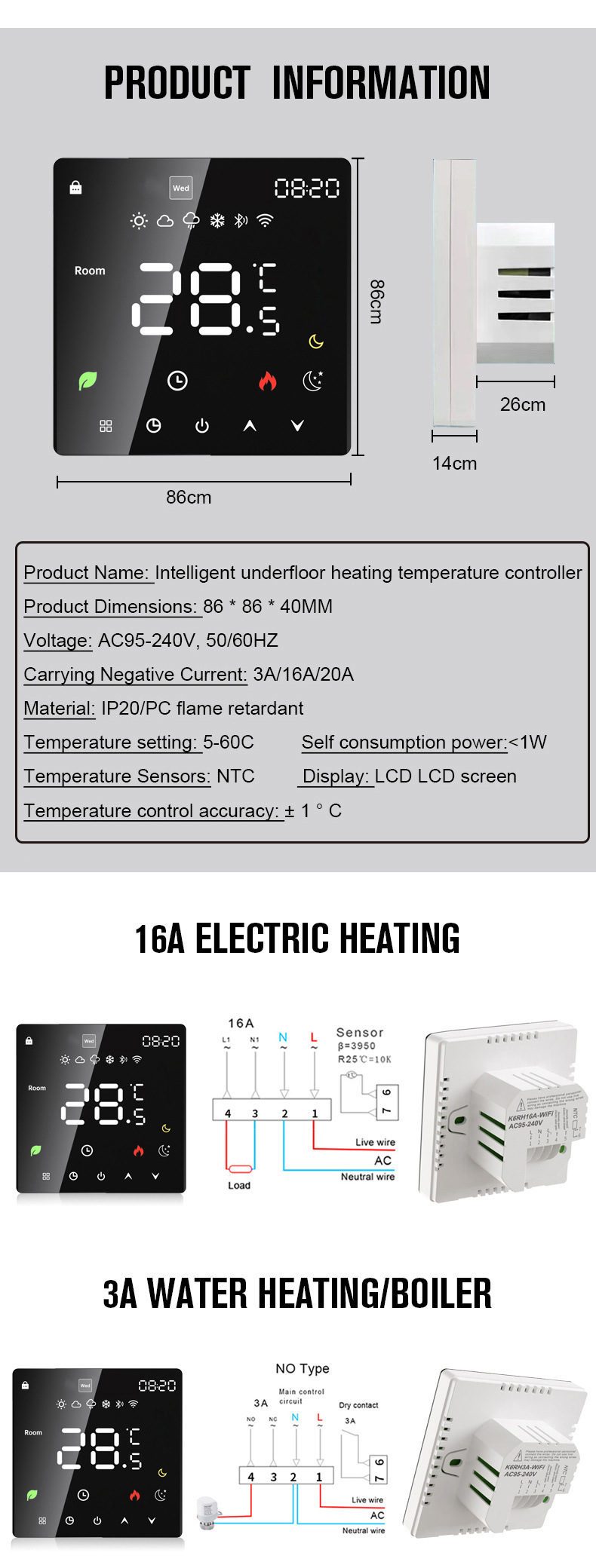 Product Parameters Input Voltage:AC 90-240V,50-60mhz Load Current: plumbing 3A (resistive), electric heating 16A 20A Temperature Accuracy:+ 1°C Working Environment:-5-50°C Temperature Setting:5~60°C Temperature Sensor:NTC Display: LCD Power Consumption:<1W Display Range:0~50°